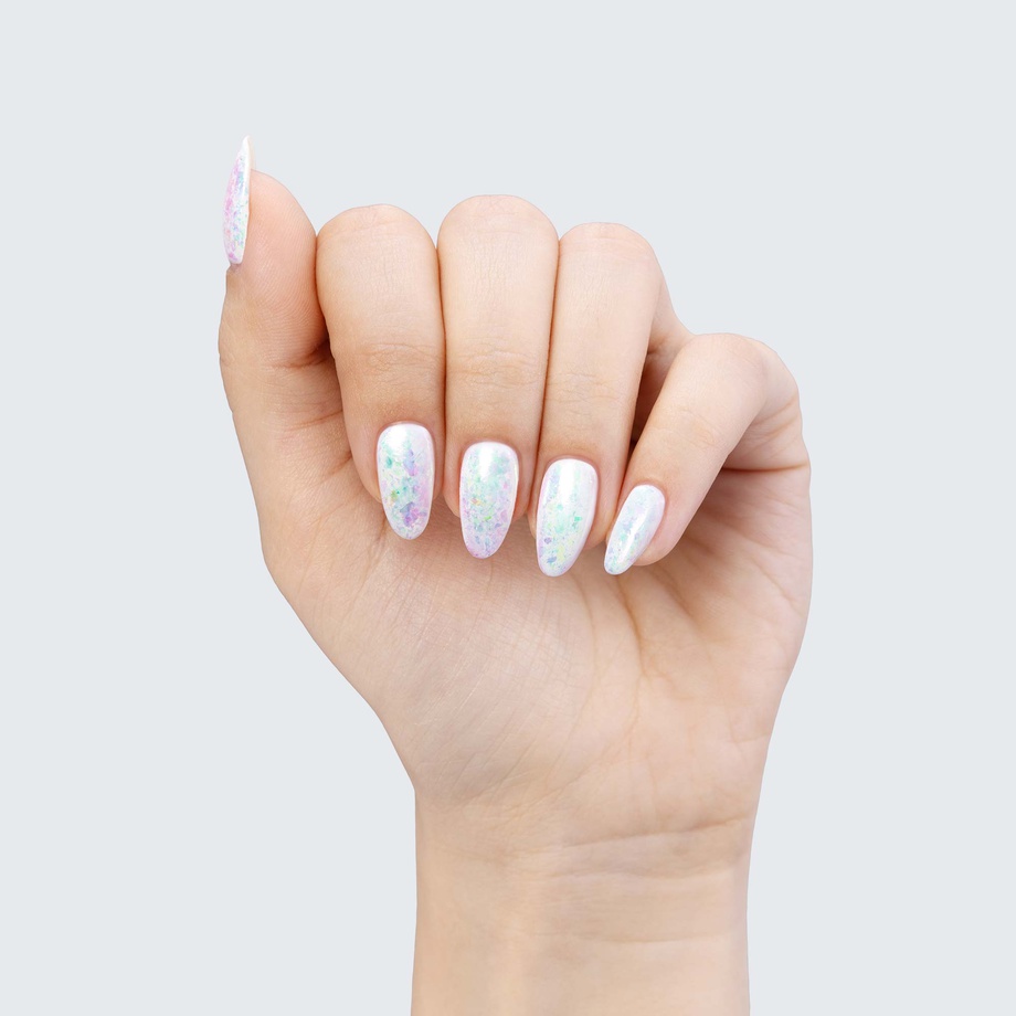 The ethereal allure of PRECIOUS FLAKES makes them a marvelous choice for manicures whose beauty can outreach any stretch of imagination. Because they are semi-translucent, each individual colour scheme takes on surprisingly varied hues depending on which gel polish you use as a base.